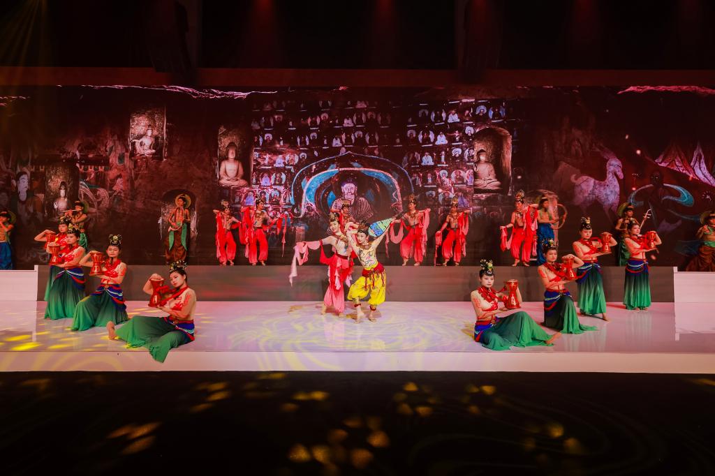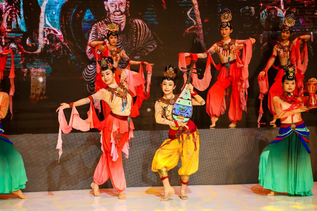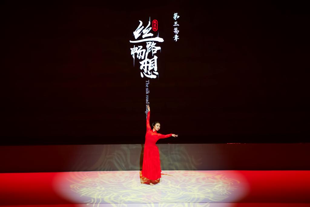 敦煌地处丝绸之路咽喉要地,由于它丰富的敦煌艺术和石窟艺术,被称为丝绸之路上的明珠。由孙艺桐、李鑫蕊两位老师领舞,带领数十名舞者上演“敦煌风”,用灵动、柔美的身段展示着陆上丝绸之路上敦煌壁画的神韵,舞出了一幅美轮美奂的丝路风情,为观众呈现如诗如画、绚丽多彩的敦煌盛景!